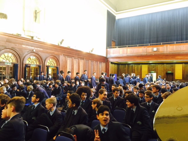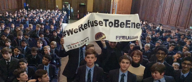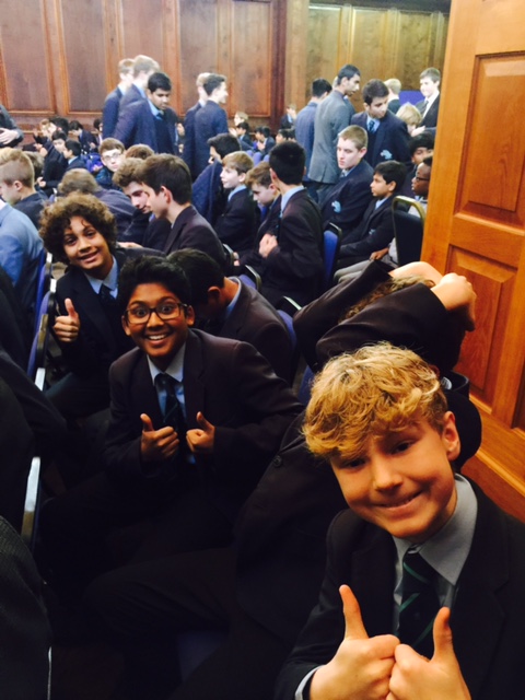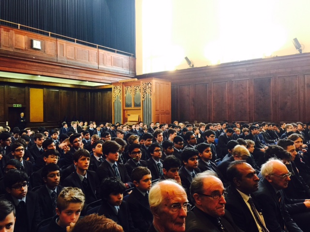 Over 300 boys and several teachers attended. As they got into the spirit of twinning Muslims and Jewish boys enthusiastically held banners together in the Memorial Hall and outside for our group photo.