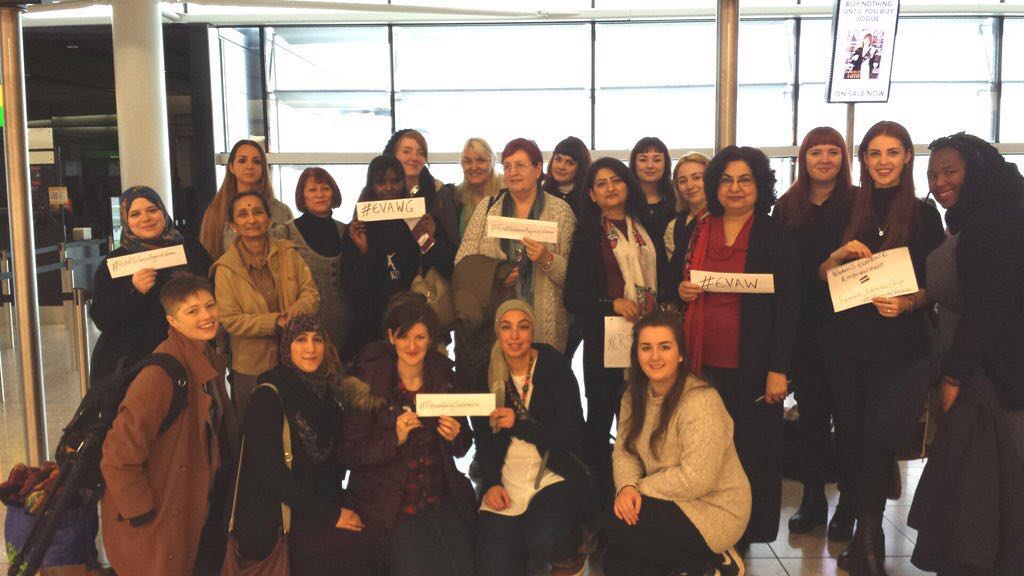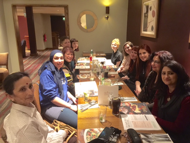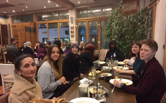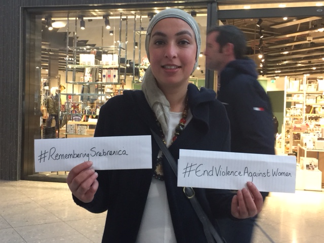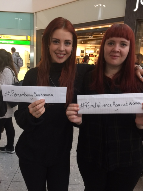 Our women’s delegation to Bosnia started off in London. Here we are at the London Heathrow Airport holding posters saying “Remembering SREBRENICA” and “End Violence against women”. We stayed in a hotel together where we had a nice meal the night before including celebrating the birthday of one of our delegates Heather Fletcher.