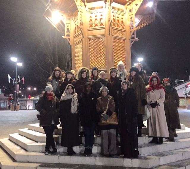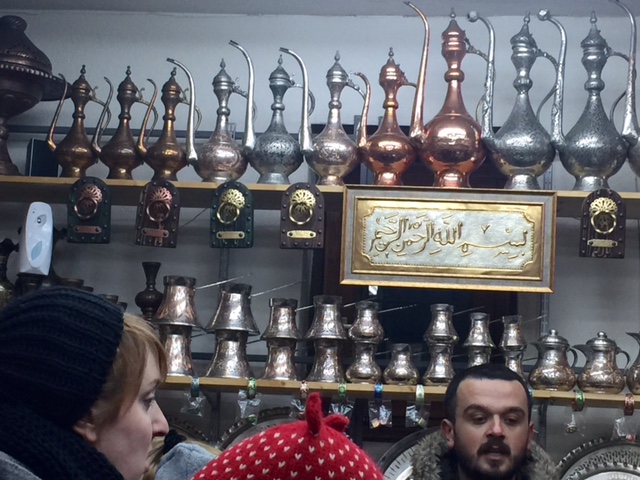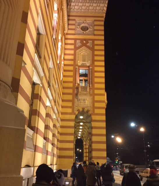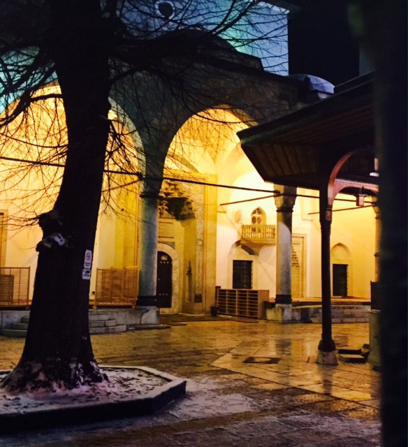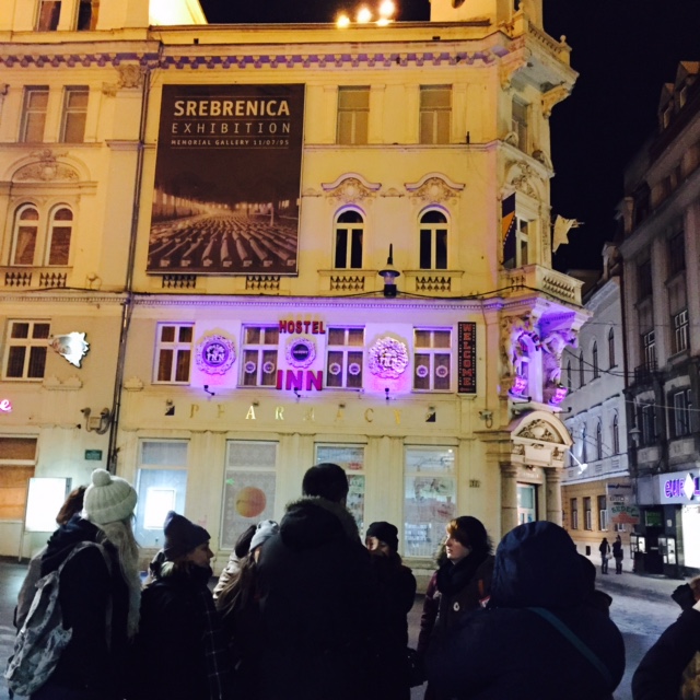 Straight after landing in Sarajevo we were taken on a wonderful guided tour of the marvelous city center where East meets West. As you can see from the picture ‘SPIN & GO – Sarajevo meeting of cultures’. We visited the shops, the local grand mosque & the madrasa. We also heard the history of the old Jewish synagogue. The shops reminded me of Istanbul. There is a picture of us standing in the main square. It was a very icy evening!